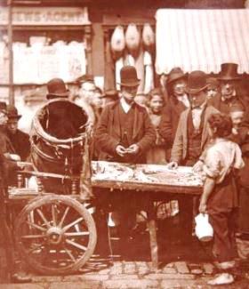 Christopher Mallindine died in 1844 and as a result, the family was left in a dire financial state but they managed to stay together. In 1847, Thomas’ sister Ann married Alexander Bass who had apprenticed as a Glass Cutter or Glazier and by 1851, Thomas was living with them at 4 Vine Place in Spitalfields and working alongside his brother—in—law as a Glazier. But by 1858, Thomas had moved to John Street and was working as a Fishmonger, selling raw fish and seafood such as cockles, musssels and oysters; his occupation is later listed as a General Dealer or Hawker so he likely started selling fish from a cart in the street markets but may have moved on to selling other items.