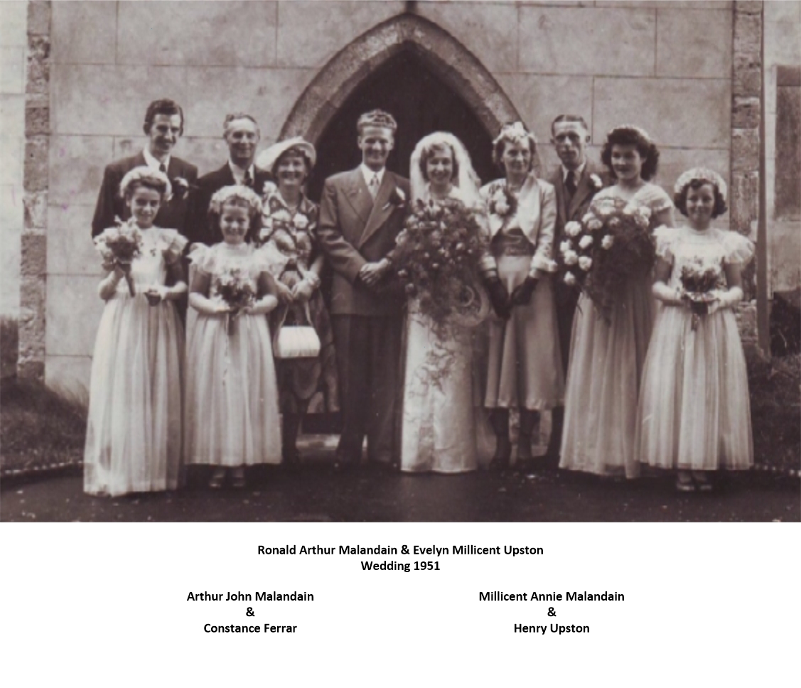 In 1951, their son Ronald married Evelyn Milicint Upston, his first cousin, in Brighton. Evelyn was the daughter of Milicent Annie Malandain, Arthur's younger sister, and Henry George Morrill Upston. Ronald and Evelyn had three children and lived in Brighton for many years.