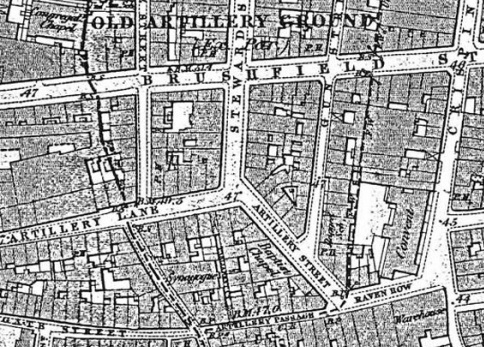 Jaques and Susanna had two sons; their first, Jaques, was born on 2 November 1737 and baptised at Threadneedle Street one day later. In 1739, the family was living in the Old Artillery Ground in Spitalfields. Originally the outer precinct of the Priory and Hospital of St Mary Spital, the area was converted to an Artillery Ground in 1538 under Henry VIII for the use of The Fraternity or Guild of Artillery of Longbows, Crossbows and Handguns. This group was later known as the Honourable Artillery Company and used the Ground in conjunction with the Gunners of the Tower of London. In 1658 the Honourable Artillery Company moved to a new ground in Bunhill Fields leaving the Gunners of the Tower in sole possession of the area until 1682 when it was sold off to speculative builders. The area was later developed for housing but street names such as Fort Street, Gun Street, Artillery Passage and Artillery Lane recall its former use.