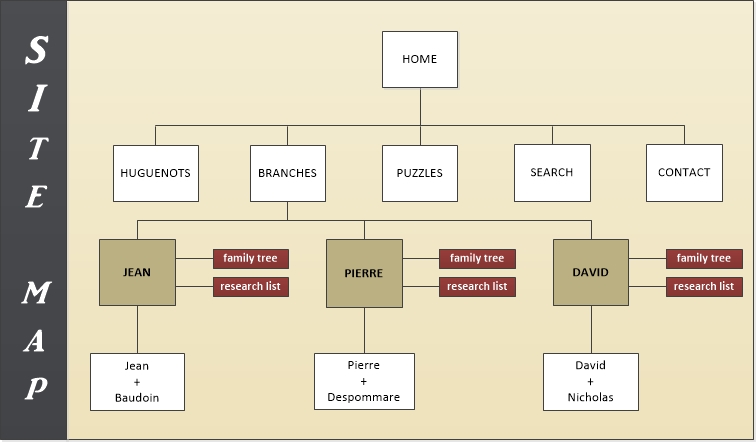 To locate an individual, use the Google site search on the Search page. You can also go directly to a specific family page by entering the name in your web browser’s address bar. All of the family pages follow the same naming convention of the first name followed by their spouse’s last name with the two names separated by a period. For example, Jean Mallandain and Marthe Baudoin can be found by entering: jean.baudoin.htm