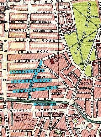 Despite the three moves in five years, the family remained in a rather small geographical area across the Regent’s Canal from Thomas’ childhood home on Alfred Place (renamed Talavera Place). Regents Row ran alongside the northern bank of the canal and the three streets that ran parallel to Regents Row to the north were Pownall Road, Broke Road, and Brownlow Road with Marlborough Road bisecting each of them.