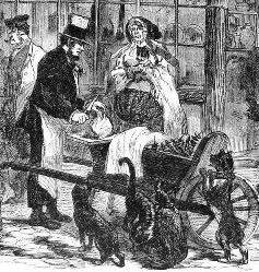 Over the years, Thomas Rye appeared in the census records as a Costermonger, General Dealer and Hawker but there were also periods where he worked as a Dock Porter and in 1901, as a Herring Curer. It seems that while he sought other work, his wife Sarah carried on his work in the street markets but it isn’t until the 1901 census that there is any indication of exactly what wares they sold in the markets. While Thomas was working on the docks in a herring factory, Sarah was working as a Hawker selling cat meat. Thankfully, this meant she sold cheap meat scraps for pets rather than selling actual meat from cats. The Cat’s Meat Man (or woman) would visit the local slaughterhouse or knacker’s yard and purchase scraps of meat, most often horsemeat, and offal that was not fit for human consumption. They would then make their rounds often calling out ’meat, meat’ to attract their customers’ attention.